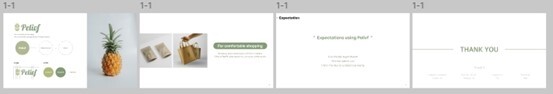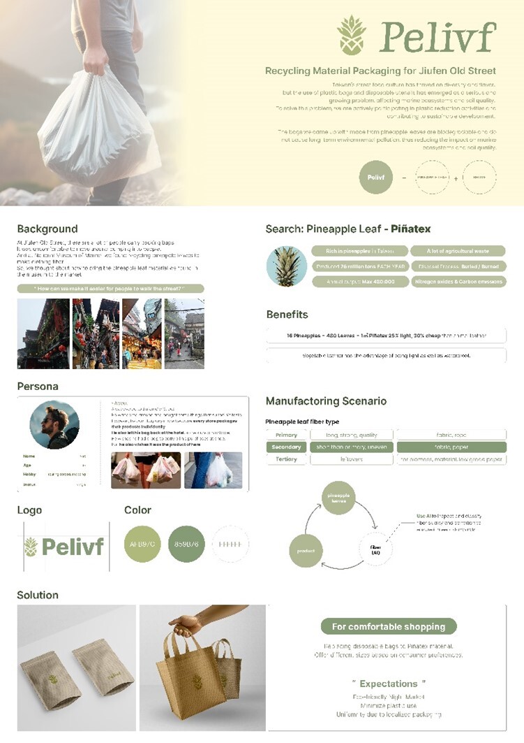 本次我們這組的作品平稱是-Pelief 因為我們發現台灣不管去哪都有一堆塑膠用來裝食物、紀念品和飲料等等,但塑膠袋在自然環境不易分解,對環境的污染和破壞極大,並於國立海洋科技博物館發現,每年鳳梨葉子有高達70萬公噸的廢棄物,不是焚燒當堆肥或是就地掩埋,也造成環境汙染;但透過抽取纖維可以做成減少永續使用的產品外,並透過AI通過技術結合,可以提高產品的生產效率和品質控制水準,使得這項創新更具競爭力和對環境的永續議題;如果有機會發展下去,我們相信這項技術和產品將對環境保護和永續發展做出重要貢獻。