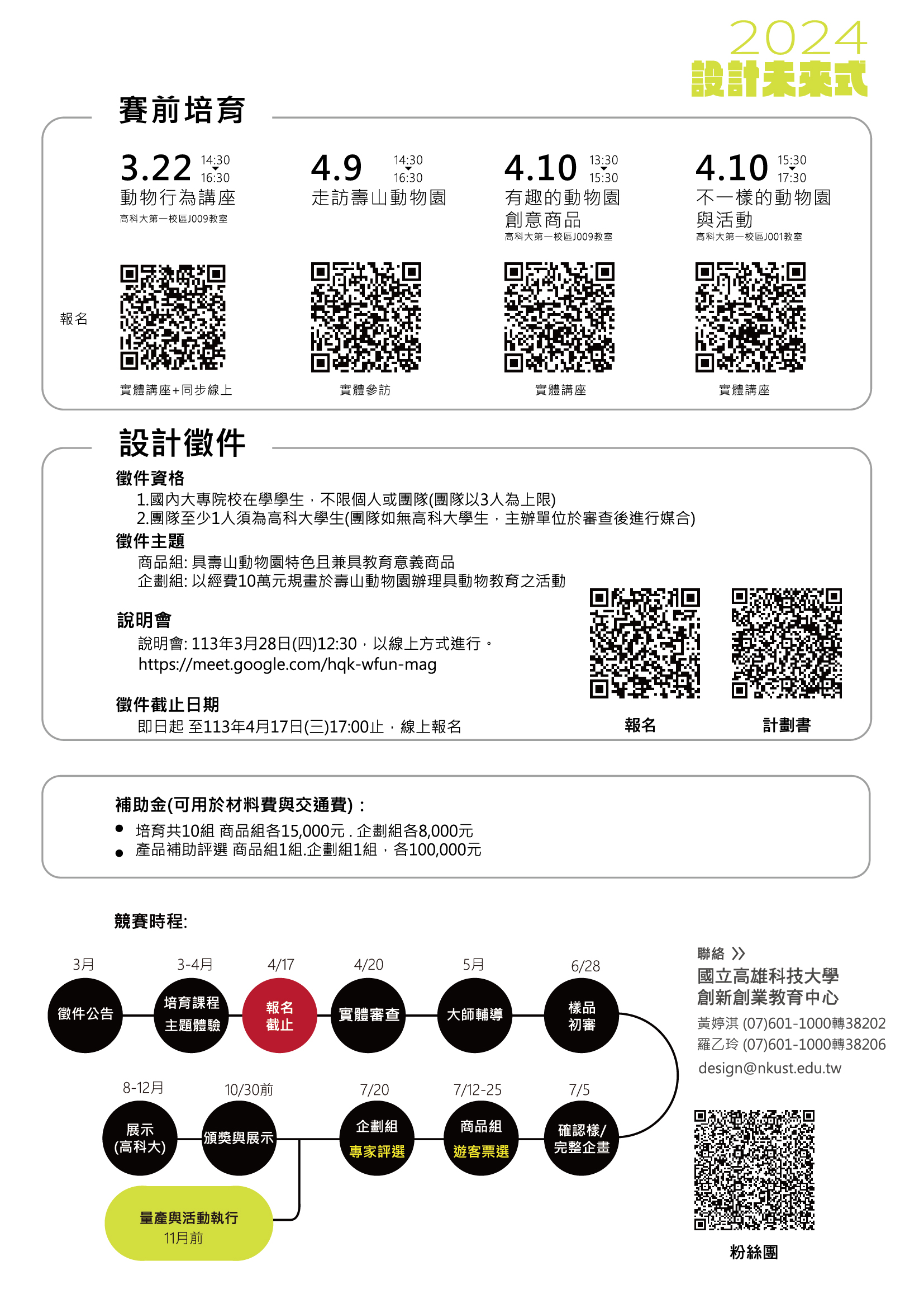 國立高雄科技大學創新創業教育中心為提升學生之商品化與企劃實務能量,讓學生商品開發與企劃能力接軌業界與市場需求,特辦理設計與企劃徵選人才培育,徵集設計新秀,本計畫輔導商品成果將媒合通路銷售,讓學生完整體驗從設計到生產與銷售端流程,累積實務經歷。同時培育學生企劃能力,鏈結壽山動物園。